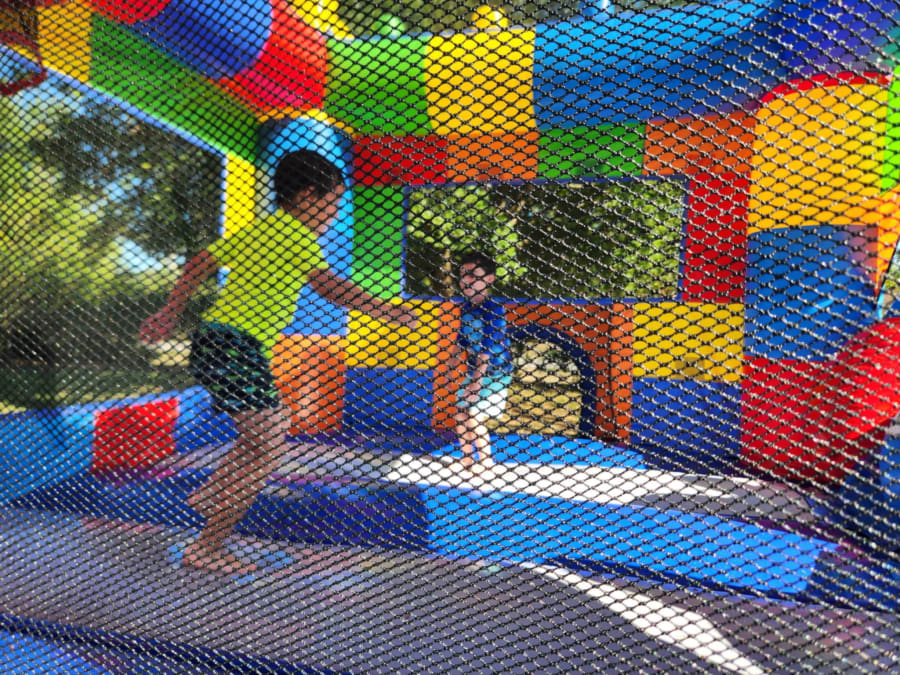 Welcome to the block party! Our amazing Blocky Bounce combo features a colorful "building block" theme that all kids will love! Crawl in and jump around the bouncehouse which features a baskeball hoop! Then climb up and slide down one of the two slides into the pool below (or rent this "dry" and we'll take the pool off and supply a gym mat to land on). This is going to make your party a surefire hit!