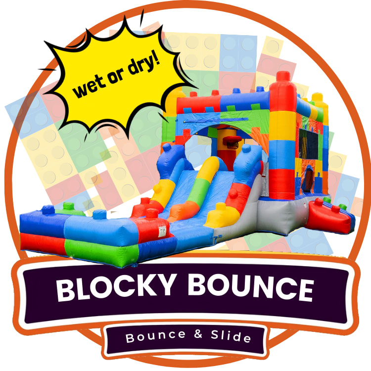 Welcome to the block party! Our amazing Blocky Bounce combo features a colorful "building block" theme that all kids will love! Crawl in and jump around the bouncehouse which features a baskeball hoop! Then climb up and slide down one of the two slides into the pool below (or rent this "dry" and we'll take the pool off and supply a gym mat to land on). This is going to make your party a surefire hit!