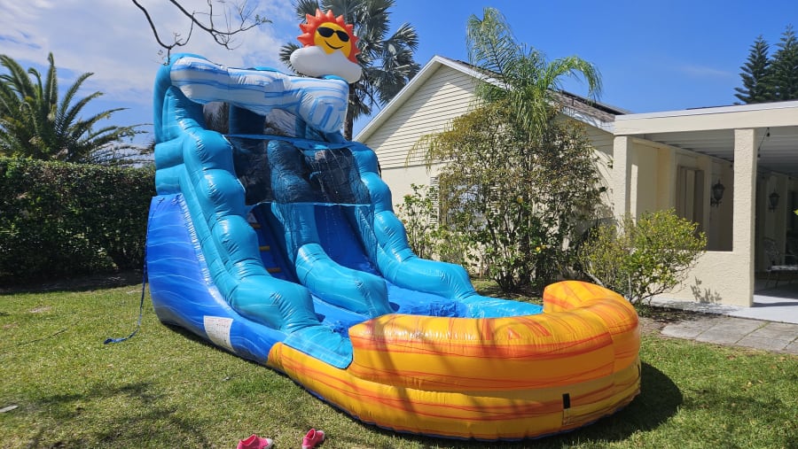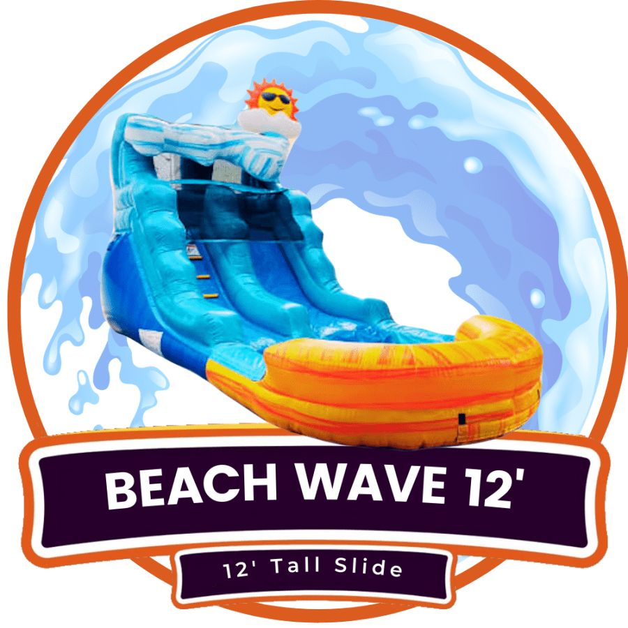 Our 12' tall Beach Wave waterslide is sure to delight with its bright colors, whimsical "wave' and sun. With a slide platform of 6' it's perfect for kids age 3-7 to climb the steps and slide down into the pool. It's sure to be a hit for you next summer backyard bash.